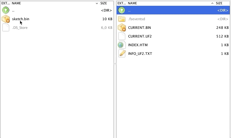 Unter MacOS funktioniert das Kopieren der .BIN-Datei per Drag & Drop leider zurzeit noch nicht. Eine Möglichkeit ist die Datei im Terminal per dd-Befehl zu kopieren (nur erfahrenen Nutzern zu empfehlen!) oder einen alternativen Dateimanager wie zum Beispiel muCommander zu verwenden.