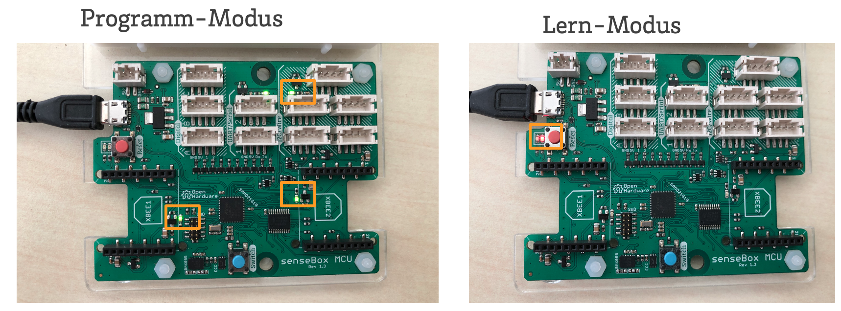 Die senseBox MCU verfügt über zwei Modi. Den Programm- und den Lern-Modus.