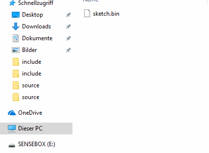 Nun kannst du die zuvor heruntergeladene .BIN-Datei einfach per Drag & Drop auf den Wechseldatenträger SENSEBOX kopieren. Die senseBox wird nun deinen hochgeladenen Sketch abspielen.