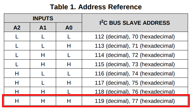 Hervorgehoben in der Tabelle wurde die Standardeinstellung mit der Adressierung 0x77.