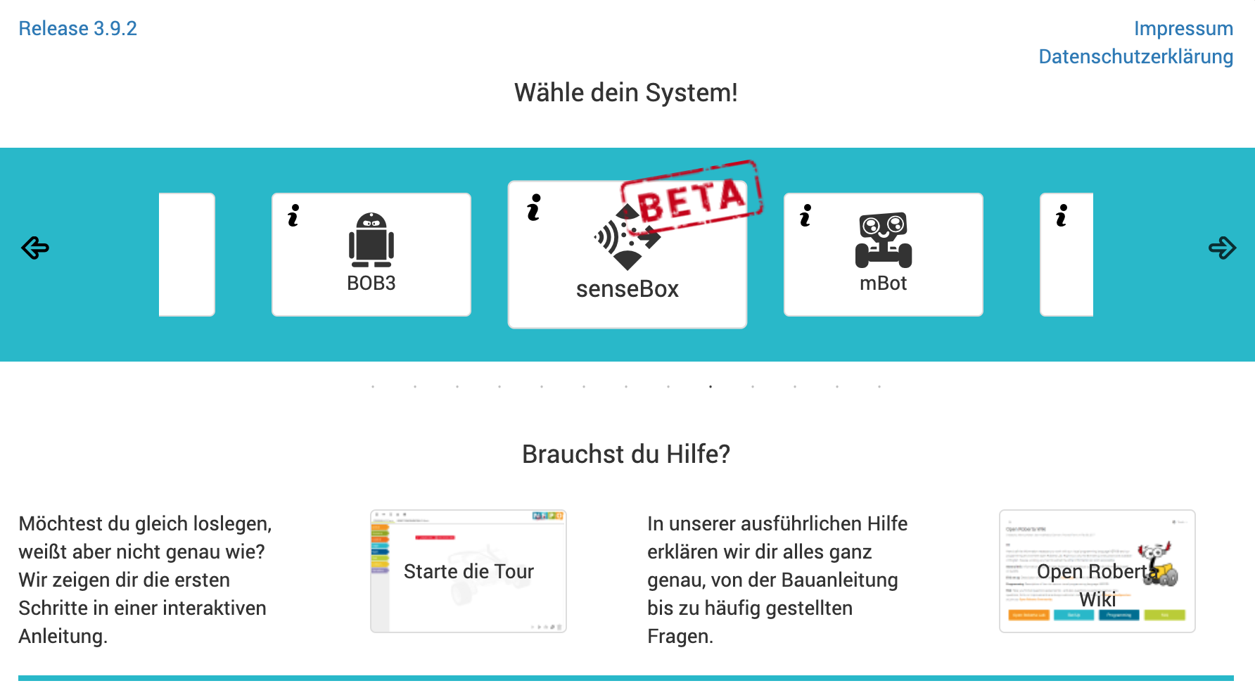 Öffne das Open Roberta Lab unter lab.open-roberta.org. Dort musst du zuerst dein System, also die senseBox, auswählen.