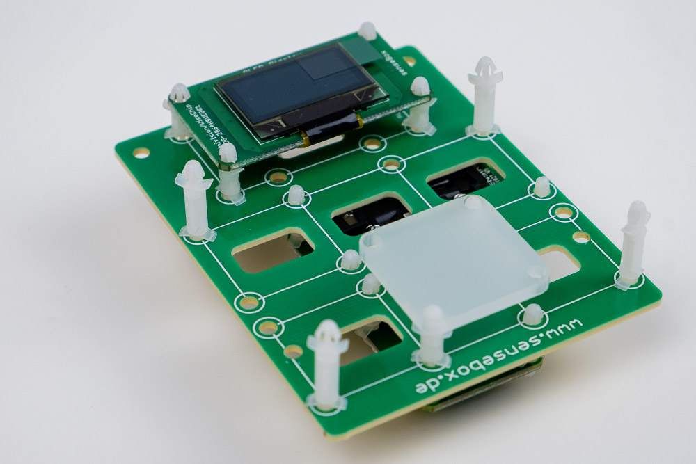 An die Sensorhalterung werden das Display, der CO2-Sensor und die RGB-LED angebracht. Später wird sie mit der Hauptplatine verbunden und getestet.
