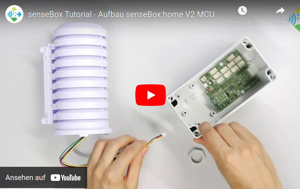 Einsetzen der senseBox MCU in das Gehäuse: 0:10 Aufsetzen des WiFi-Bees: 0:46 Aufbau des Strahlenschutzgehäuses mit Temperatur- und Luftfeuchtigskeitssensor: 1:18 Aufbau des Feinstaub-Sensors (SDS011): 2:18 Anbindung der außenliegenden Sensoren und des USB-Kabels: 4:34 Anbindung der Montageebene für Sensoren im Gehäuse. Anschluss des Luftdruck- und Licht-Sensors: 5:56 Letzte Schritte: 7:49