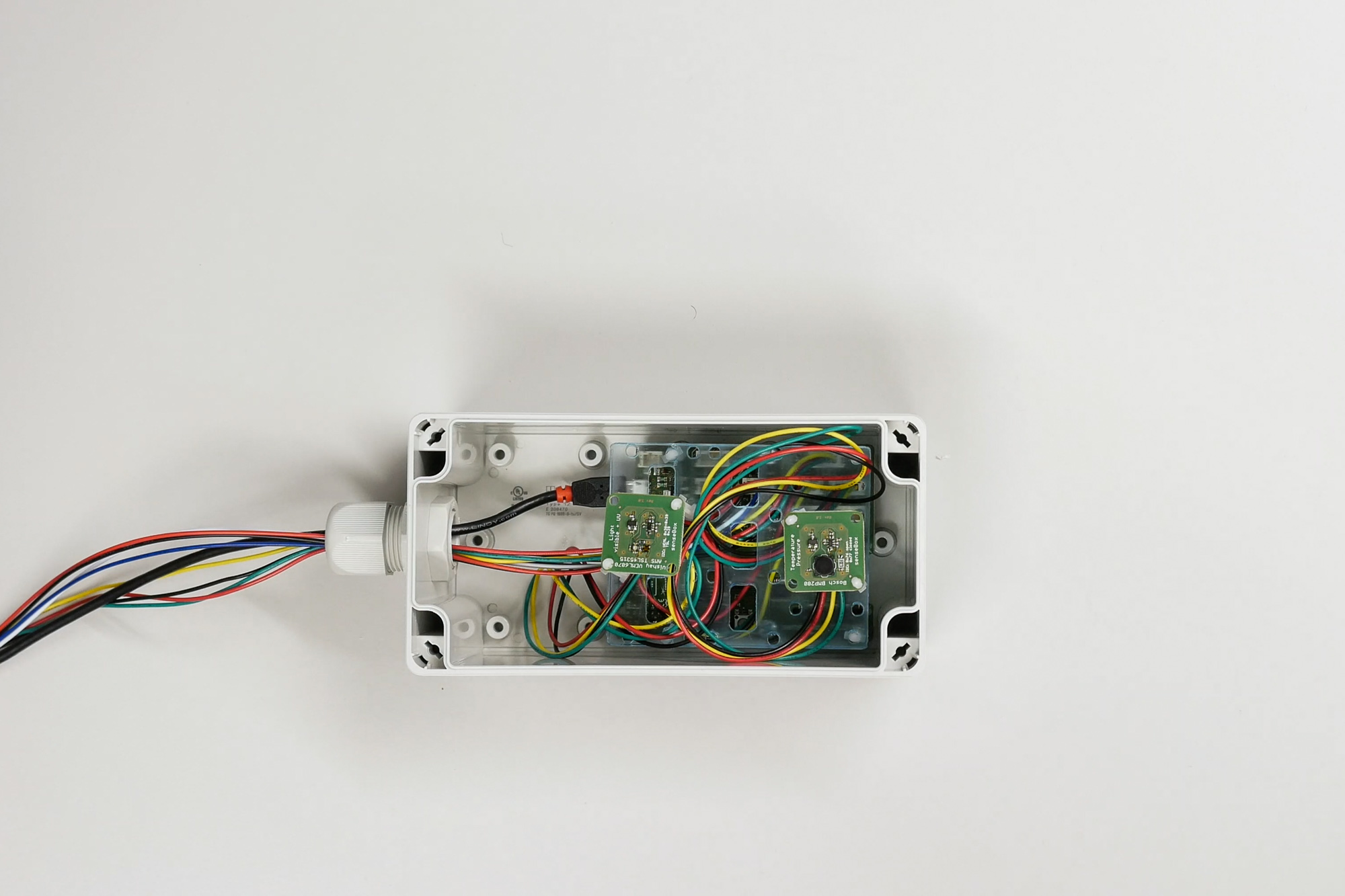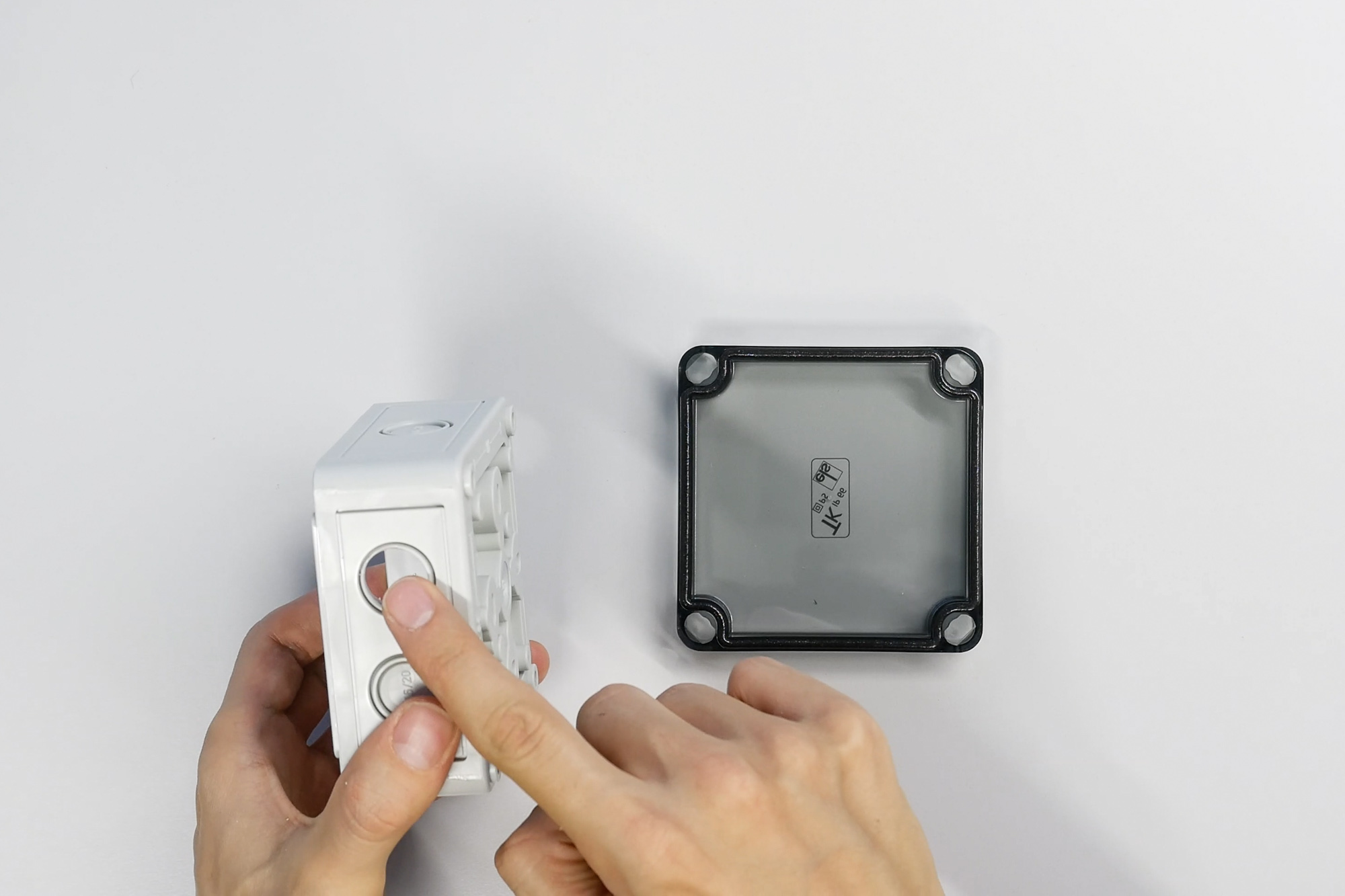 Dazu muss das Gehäuse für den Sensor mit Öffnungen für Kabel und die Luftzufuhr versehen werden. Die Öffnungen sollen gegenüberliegend auf den Seiten mit jeweils zwei Sollbruchstellen liegen. Aus Sicherheitsgründen empfehlen wir die Öffnungen aufzubohren. Theoretisch, kann man die Öffnungen aber auch an den Sollbruchstellen mit einem stumpfen Gegenstand aufschlagen.