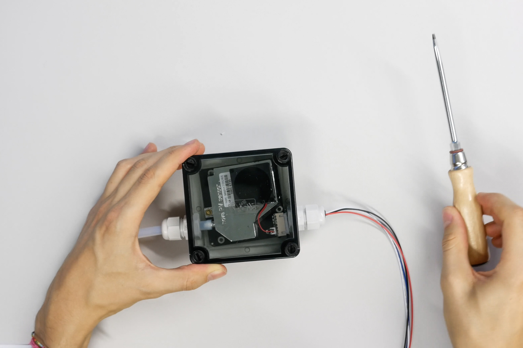 Der Luftansaugstutzen wird seit einiger Zeit mit einem Filter ausgeliefert. Dieser Filter sorgt dafür, dass grober Dreck und Insekten nicht in den Sensor gelangen. Hier benutzen wir auch eine Kabelverschraubung, um den Schlauch abzudichten. Dann heißt es wieder alles richtig einsortieren. Am Ende ist etwas Druck auf den Schlauch nötig, um ihn auf den Stutzen aufzusetzen. Als letztes noch den Deckel aufsetzen und der Feinstaubsensor ist fertig.