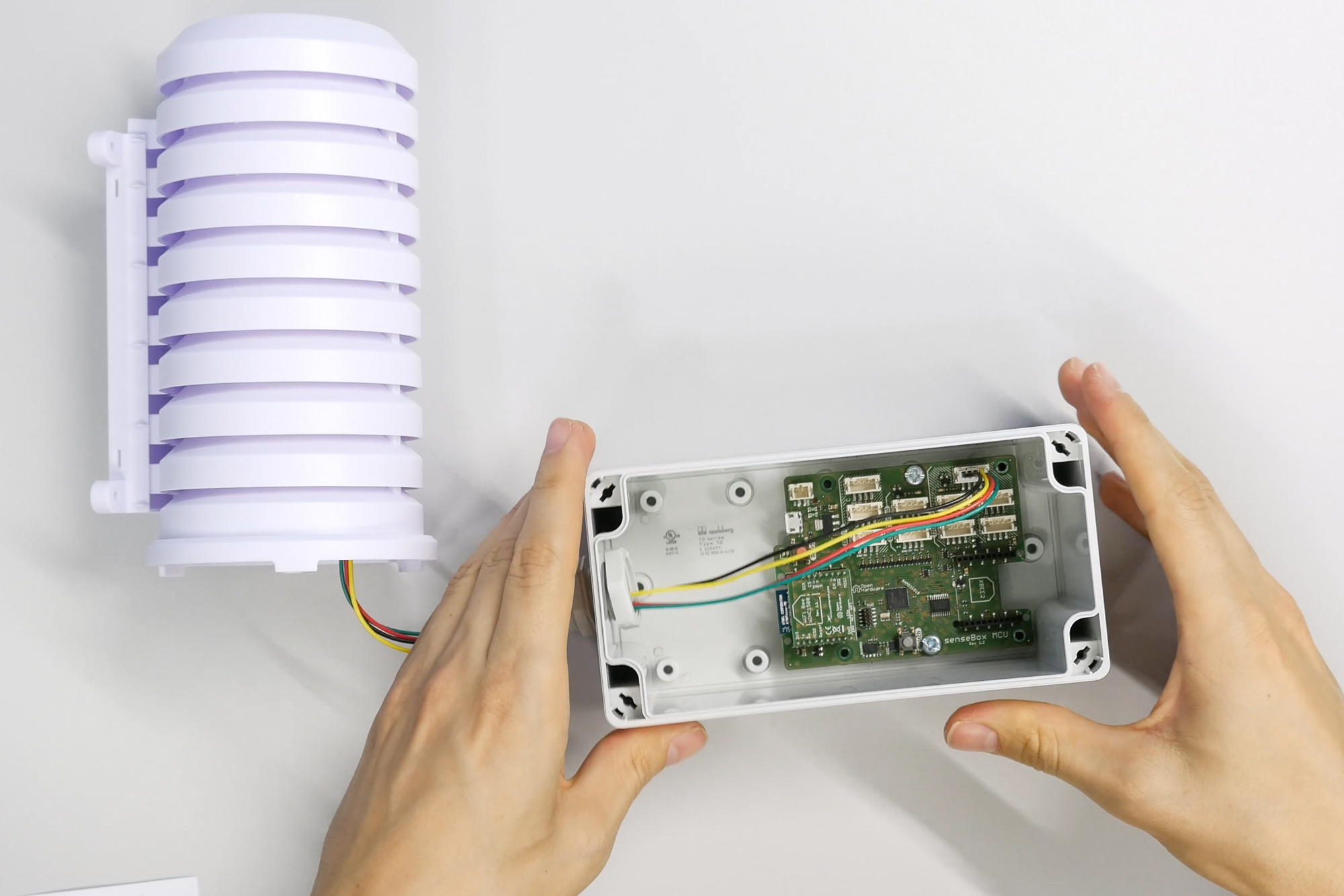 Zuerst wird ein langes senseBox Kabel durch die Öffnung im Boden des Strahlenschutzes gezogen und der Temperatur- und Luftfeuchtigkeitssensor innen angesteckt.
