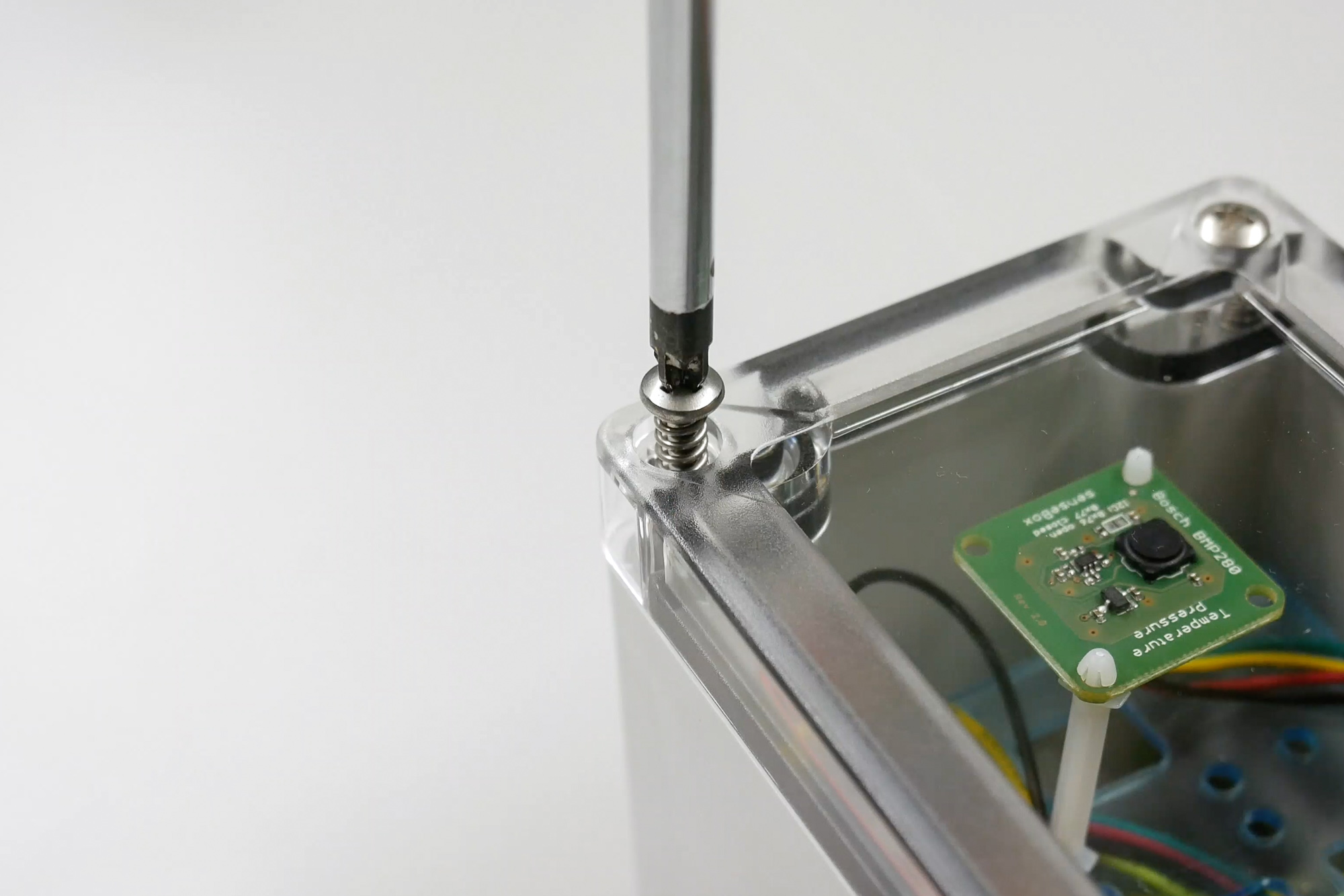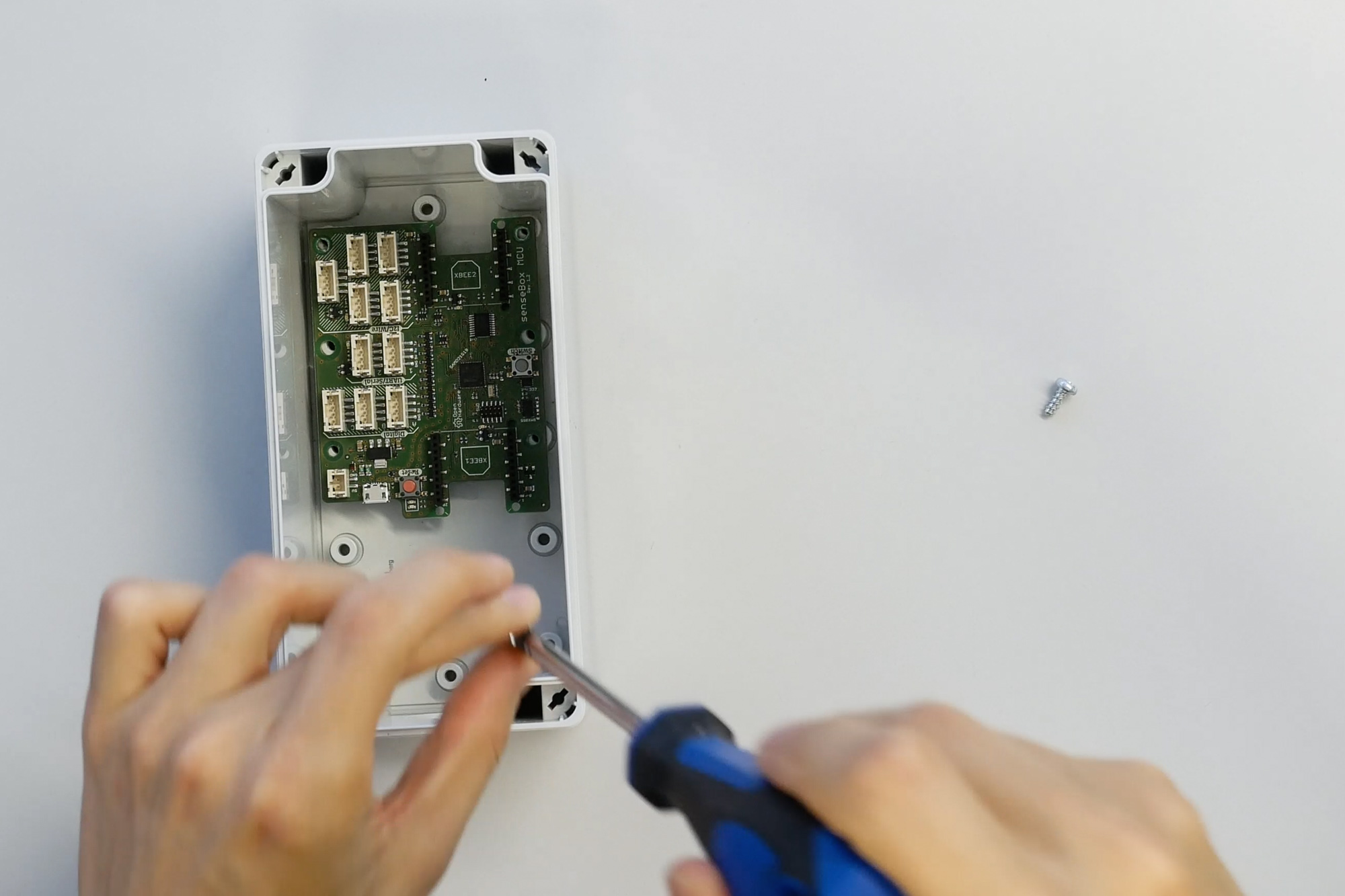 Nun werden noch die Schnellverschlussschrauben eingedreht und damit die senseBox verschlossen.