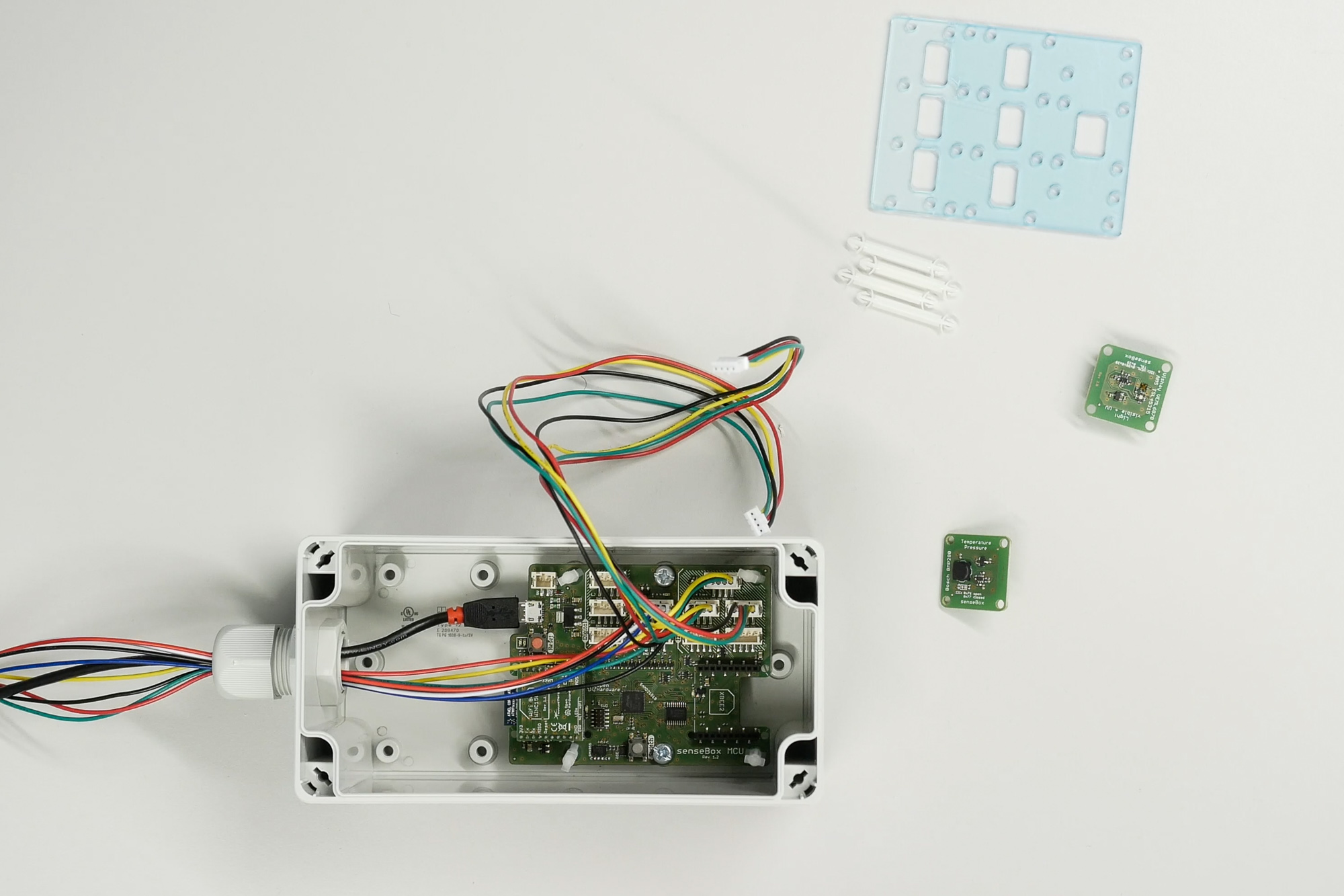 Dann wird die Montageplatte auf die Abstandshalter gedrückt und die Kabel mit den Sensoren verbunden. Die Sensoren werden mit jeweils zwei Abstandhalter ausgestattet und auf der Montageplatte befestigt. Hast du einen Lichtsensor gewählt, sollte dieser möglichst mittig im Gehäuse angebracht werden, um gute Messwerte zu erhalten. Der Luftdruck-Sensor kann in den äußeren Steckplatz.