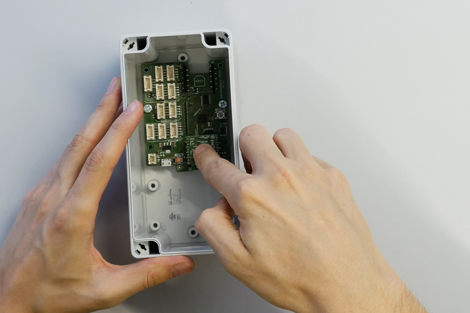 Nun schraubst du die Acryllplatte in das Gehäuse fest. Achte darauf, dass die Öffnung für den USB-Anschluss zur Öffnung des Gehäuses zeigt. Danach kannst du mit den schwarzen Schrauben die senseBox MCU auf die Acryllplatte befestigen. Hier muss wieder darauf geachtet werden, dass der USB-Anschluss zur Öffnung des Gehäuses ausgerichtet ist.