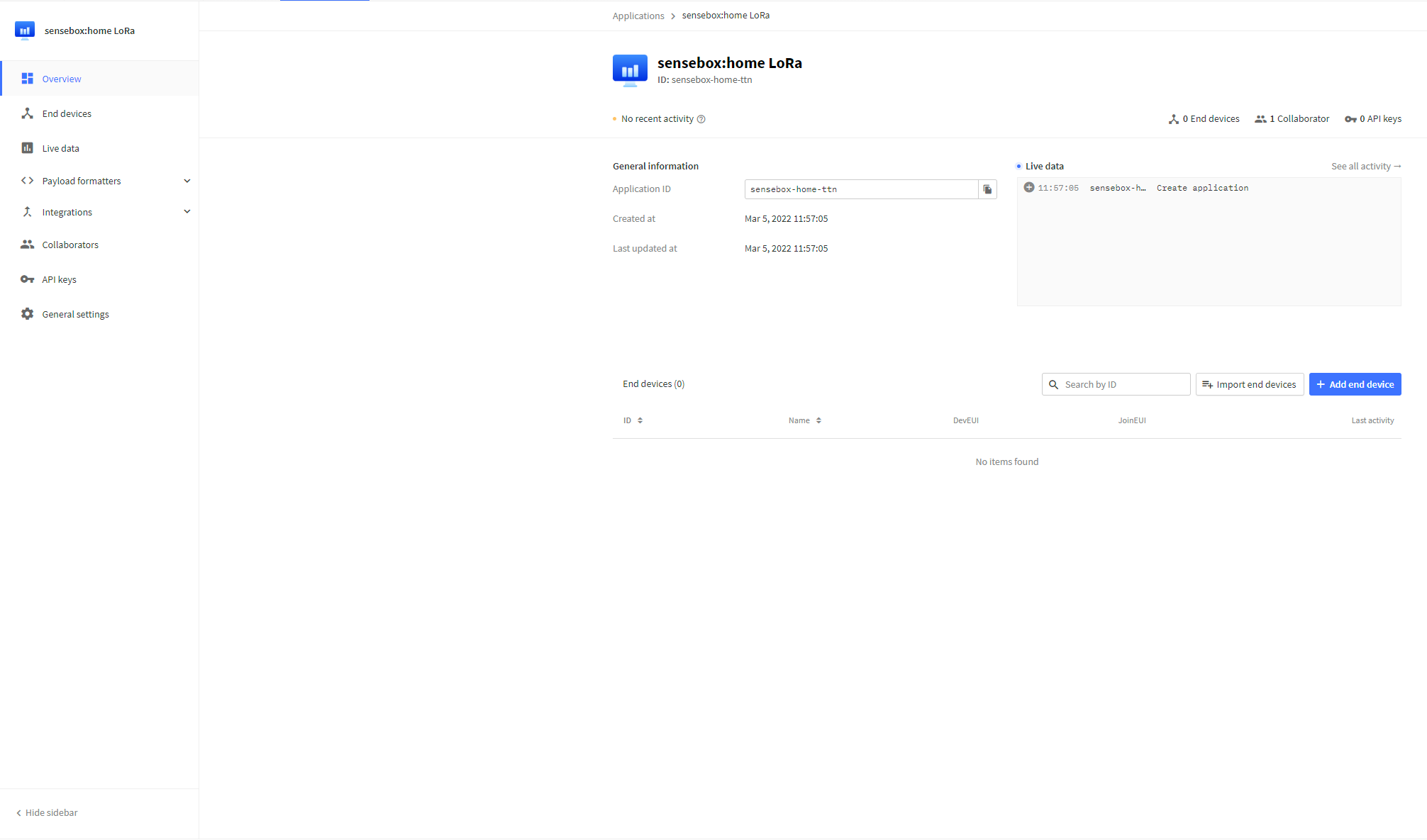 Innerhalb einer Application können nun mehrere Devices registriert werden. Klicke dazu auf + Add end device.