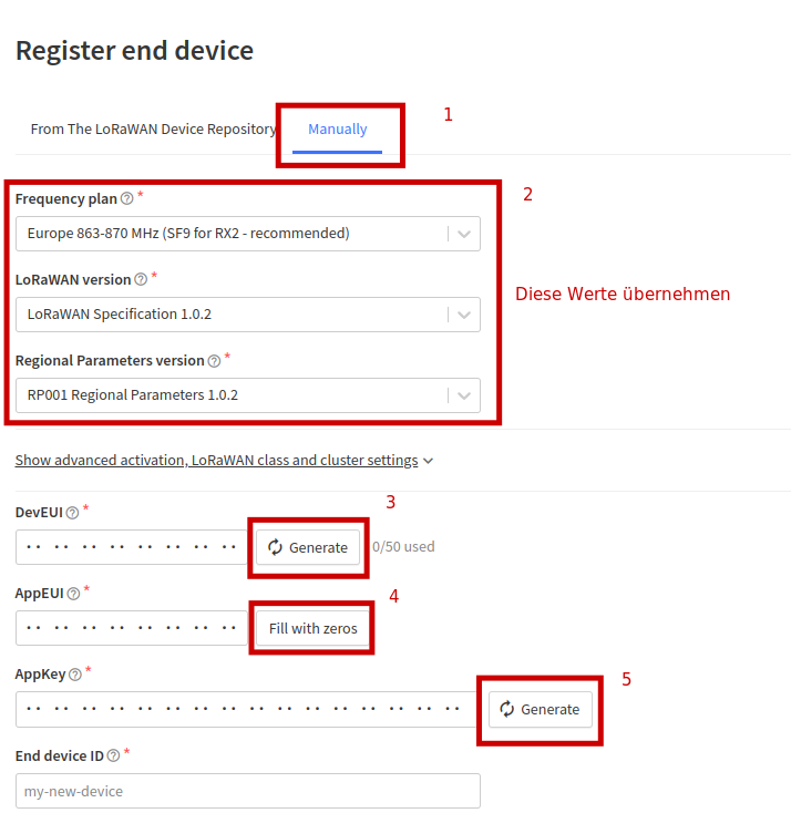 Klicke jetzt oben auf Manually und übernehme dann die Angaben die im Bild markiert sind. Anschließend generierst du die DeviceEUI und den AppKey über die entsprechenden Schaltflächen und klickst bei der AppEUI auf Fill with zeros Abschließend kannst du dem Device noch eine ID geben, oder die vorgefertigte ID nutzen. Klicke auf Register end device