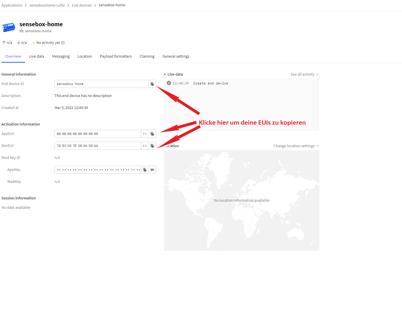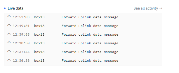 Sollten deine Daten nicht auf der openSenseMap angezeigt werden, solltest du als erstes Überprüfen, ob die Daten im TheThingsNetwork ankommen. Dies kannst du ganz einfach von der Übersichtsseite deiner Application machen. Hier sollten nun unter Live Data immer wieder Nachrichten auftauchen, die mit Forward Uplink Data message gekennzeichnet sind.